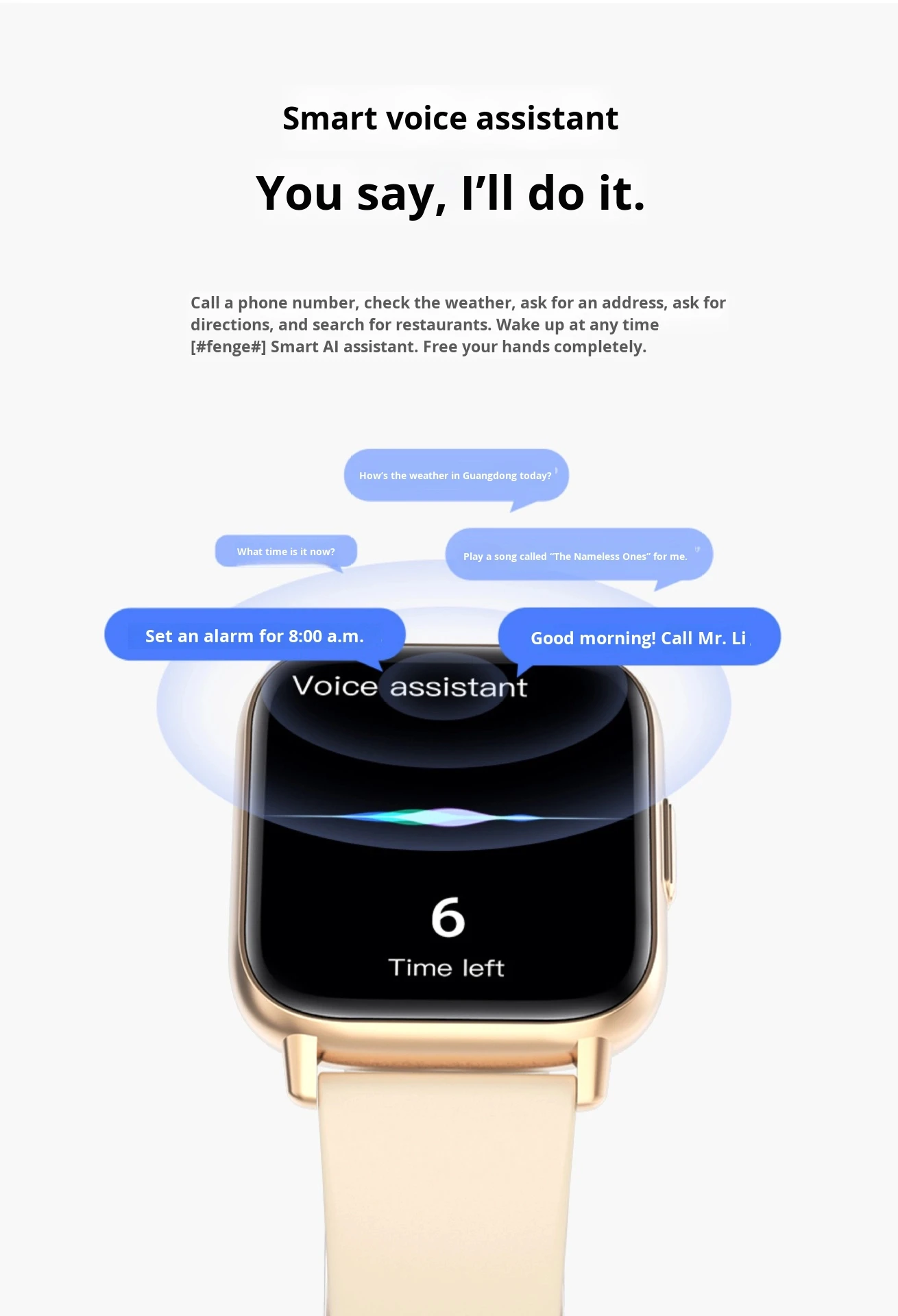 AI voice assistant, Activity Tracker, Alarm Clock, Answer Call, Breath Monitor, COMPASS, Calendar, Call Reminder, Calorie Tracker,